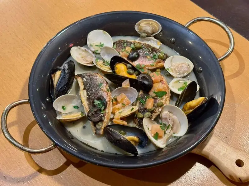 エビやイカ、アサリなどの海の幸がたっぷり入っており、魚介の旨みがぎゅっと詰まった一品です。豪華な盛り付けでシェアにもぴったり。