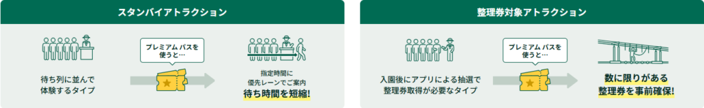 プレミアムパスは“アトラクション用の追加パス”であり、入場券の代わりにはなりません。体験者1人につき1枚の購入が必要で、バギー系アトラクションでは助手席に乗る場合も同様です。また、当日の状況により案内時刻が前後したり、アトラクションが運休する場合は利用できないことがあります。これらの条件を理解したうえで購入するのがおすすめです。